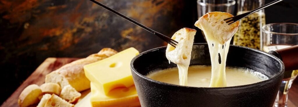 Fondue has always been associated with Switzerland. While there is no standard recipe, traditionally a Swiss cheese fondue is made with two different kinds of cheese, depending on the region of Switzerland you’re in. Regional recipes include varying amounts of Appenzeller, Gruyère, and Emmentaler cheeses.